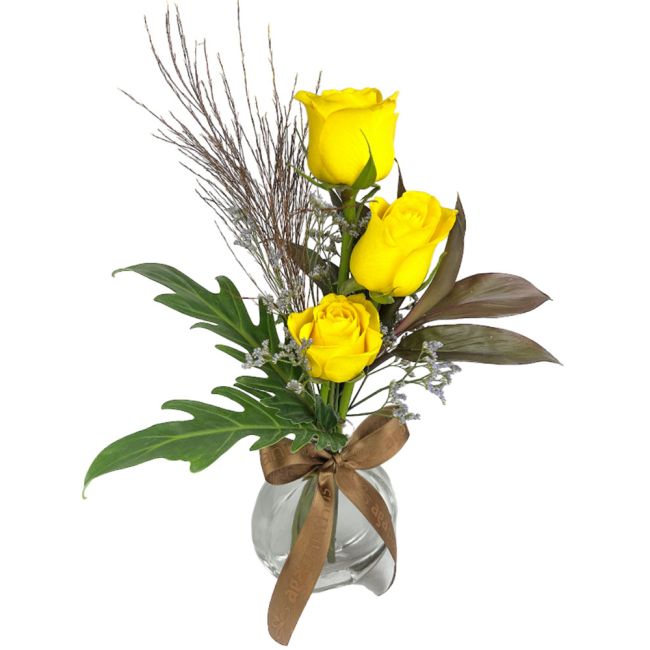 Mini arranjo em frasco de perfume com três rosas amarelas e folhagens da estação, detalhe em aspargo tinturado e limonium. Acabamento em laço de cetim.