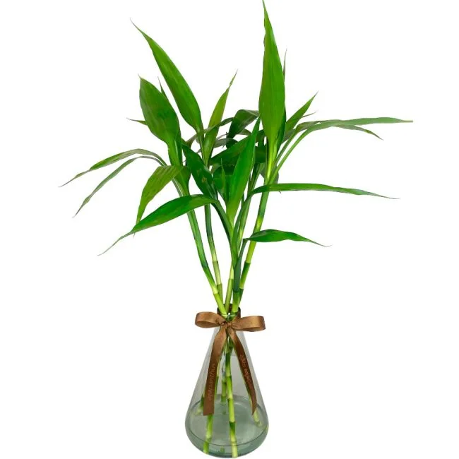 Arranjo com 5 hastes de Lucky bamboo também conhecido como bambu da sorte em vaso de vidro pirâmide transparente. Acabamento em laço de cetim.